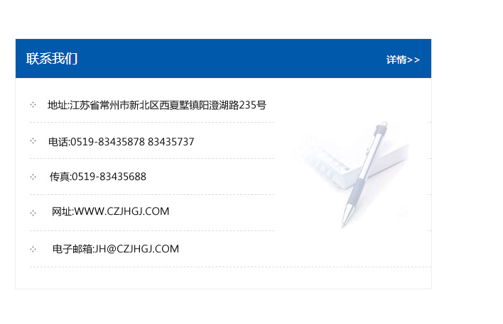 地址:常州市新北區友邦商務大廈1幢16、17層  電話:0519-85101652  傳真:0519-85112595  郵編:213022  網址:www_cz-jiayue_cn.ysgqjy.com  郵箱:xiajifengaa@163.com